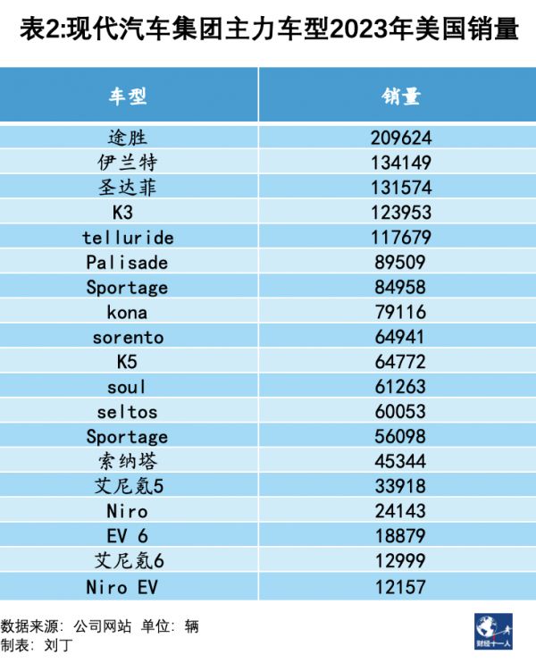 在美国,现代汽车集团的主力车型是伊兰特、途胜、圣达菲、K3、telluride,这些车型2023年销量均超过10万辆,卖得最好的电动车是艾尼氪5和EV6,销量分别达到3.4万辆和1.9万辆。
