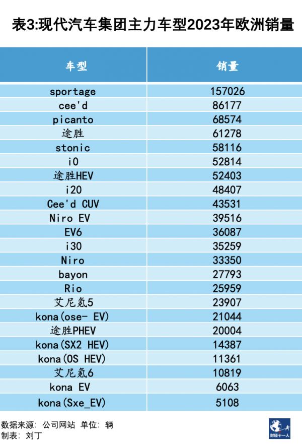 在欧洲,现代汽车集团卖得最多的车型是sportage,2023年达到约16万辆,另外,途胜系列和cee’d系列车型销量也达到约13万辆,卖得最好的新能源车型是kona系列,包括纯电、混动车型合计销量达到约6万辆,艾尼氪5和EV6车型分别为2.4万辆和3.6万辆。