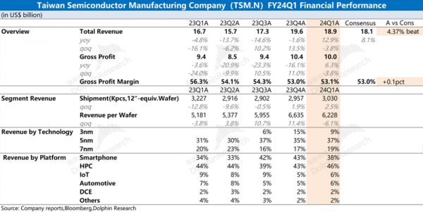 台积电(TSMC)于北京时间2024年4月18日下午的美股盘前发布了2024年第一季度财报(截止2024年4月),要点如下:
