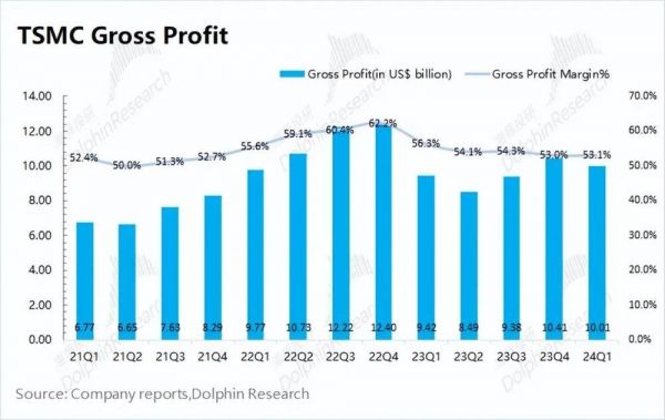 2024Q1台积电毛利环比下滑3.8%,基本都由收入端带来,毛利率环比基本持平。