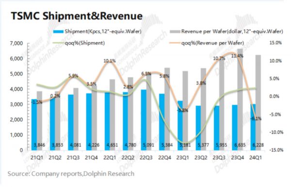 1)单片晶圆收入(等效12寸):2024Q1台积电单晶圆收入约6228美元/片,环比下降407美元/片。进入一季度,3nm出货回落,结构性拉低了公司产品的均价;