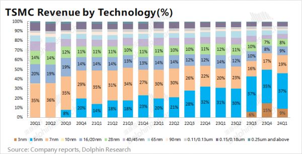 从公司给的下季度指引看,2024Q2公司业绩仍将受益于高性能计算领域的需求增长。虽然手机端需求仍有不足,但随着高性能计算的制程转向3nm,进而填充相关的产能,公司7nm以下的收入占比有望进一步提升。