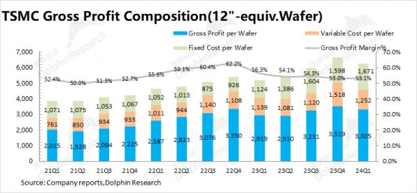 3)可变成本(其他制造费用):2024Q1台积电平均可变成本约1252美元/片,环比下滑266美元/片。单片可变成本的下降主要是制造端成本减少所致;