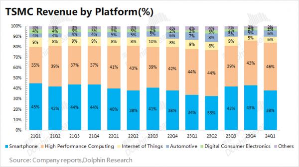 智能手机和HPC是台积电最大的收入来源,两者合计占比仍有84%,是公司下游收入的最大来源。