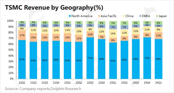 从各地区收入来看,北美地区仍是台积电最大的收入来源,收入占比近7成。这是由于北美地区有苹果、高通、英伟达、AMD等大客户,使得台积电和美国之间有很强的商业绑定关系。本次财报中,北美地区的收入占比有所下滑,这主要是因为苹果新机需求过后,3nm芯片拉货有所放缓导致。