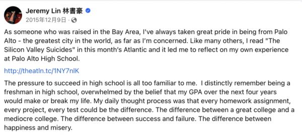2015年,当自杀潮被媒体报道后,毕业于哈佛的NBA球员林书豪发帖讲述了自己在Paly高中的心路历程。