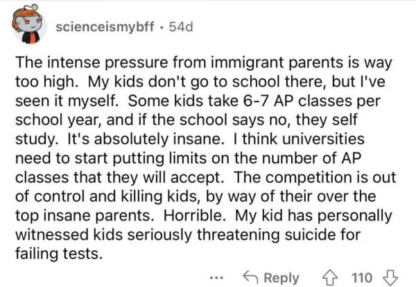 “移民家庭给孩子的压力太大了,竞争激烈得仿佛失控了一样。”