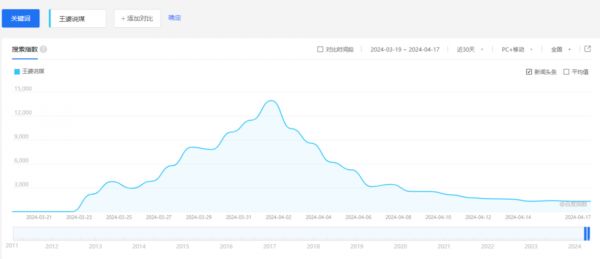 再从“王婆说媒”百度指数来看,4月1日王婆宣布休假后,其指数一路走低,从最高的13936点一路狂跌至4月17日的1302点,比起巅峰人气已经掉了近九成。
