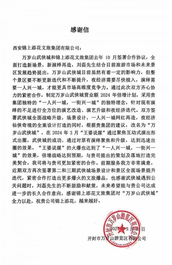 旅界获取的一封开封万岁山景区对锦上添花集团的感谢信显示,该景区对近期爆火原因归结于“采用贵集团独特的'一人兴一城,一街兴一城 '的独特理念”“改名为万岁山武侠城”等。