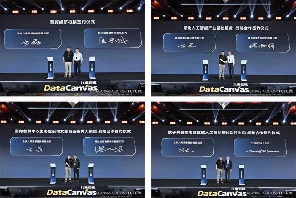 发布会期间,九章云极DataCanvas公司分别与新华出版社、曙光信息产业股份有限公司、黄山旅游发展股份有限公司以及新加坡科技公司Krakatoa Tech等海内外核心生态伙伴,正式签署四项战略合作协议,合作内容覆盖赋能智算经济、垂类大模型建设、人工智能产业基础服务、智算中心生态建设以及人工智能基础软件生态打造等领域,九章云极DataCanvas公司包括垂类大模型、智算中心等的优势业务规模将进一步巩固与拓展。