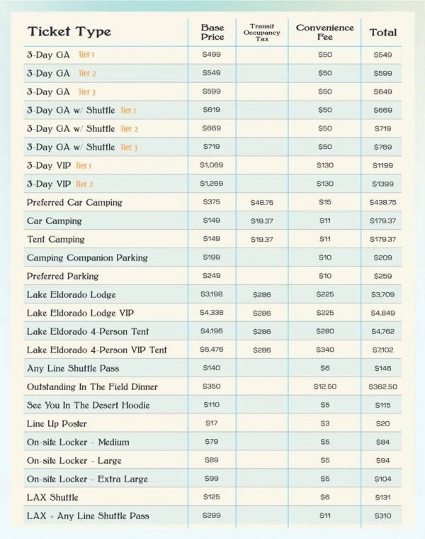 据悉,即便是在科切拉场地内,露营、停车也需要付费,比如汽车露营、帐篷露营为149美元(不含服务费),而各种现场住宿为3198美元至9000美元不等。伴随门票价格的走高,演出地点一如既往在炎热、偏僻的沙漠地区所带来的交通问题也影响大众购买门票的热情。在今年1月,科切拉发布日间停车要求,规定必须有四人以上同坐才可进场内停车场,这也极大影响了汽车露营体验。