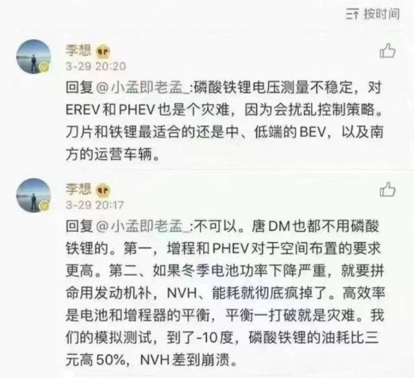 有趣的是,李想本人曾在社交媒体上吐槽过磷酸铁锂电池,指出磷酸铁锂电压测量不稳定,对 EREV(增程式混动)和 PHEV(插电式混动)是灾难。