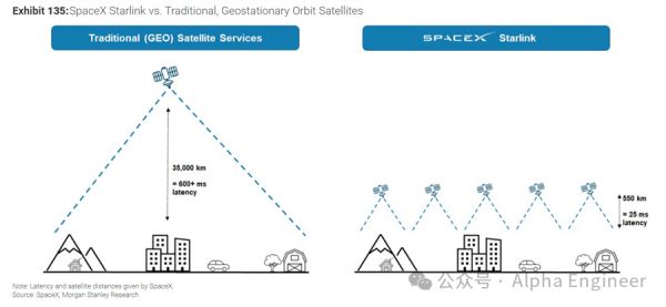 传统的卫星通信服务,往往只由一颗对地静止卫星提供。而Starlink通过在近地轨道部署几千颗低轨卫星,交织形成低空卫星互联网。Starlink的卫星运行在距离地面550千米的高空,比GEO卫星低多了。