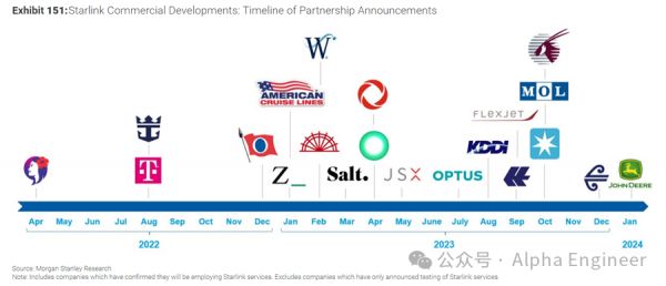 自2022年起,SpaceX已经宣布与多家电信运营商、航运公司、航空公司建立合作伙伴关系,为它们提供基于星链的卫星通信服务。