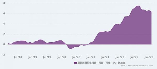 △衡量通货膨胀的一种常用方法是使用消费者物价指数(CPI),图为2018年-2023年新加坡CPI变化。图片来源:CEIC DATA