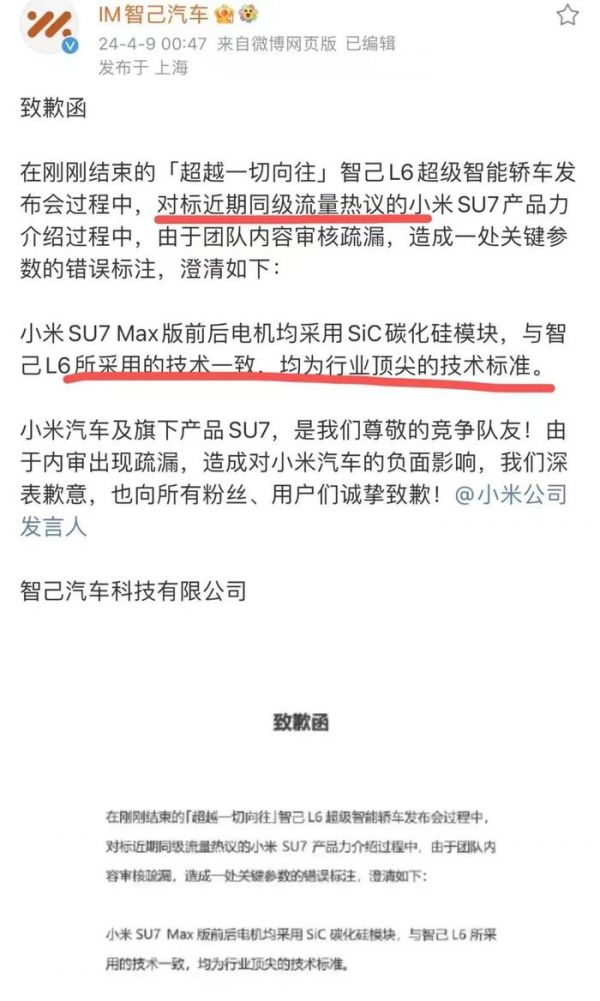 在智己L6的发布会上,智己汽车CEO刘涛本想把“雷氏对比法”活学活用,没想到却标错了小米汽车的参数,直接惹得对方连发三条问责微博,自己品牌还得灰溜溜的公开致歉。
