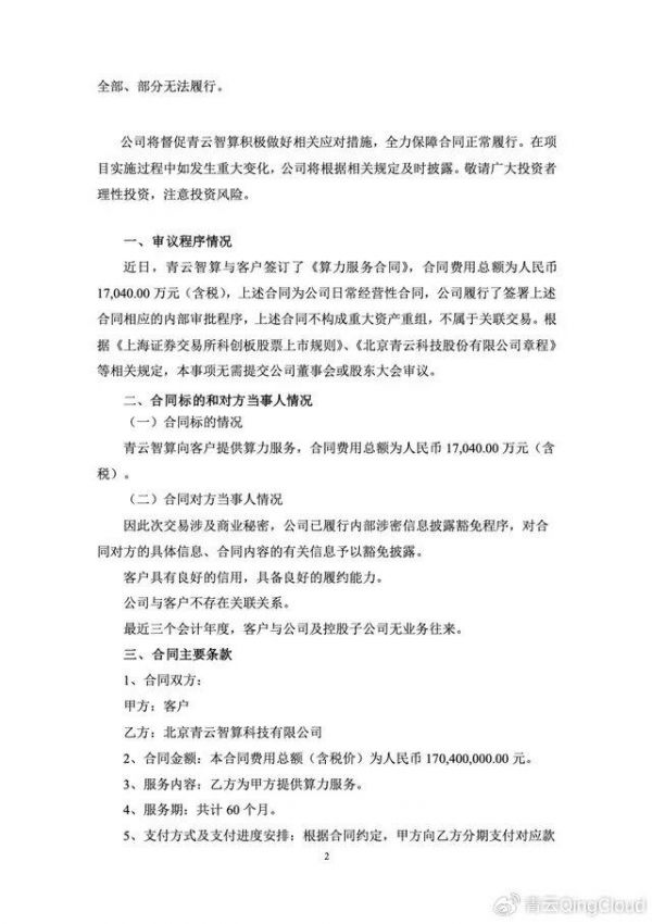 青云科技 4 月 19 日发布公告,与客户签订的《算力服务合同》,合同费用总额为人民币17,040.00万元(含税)!