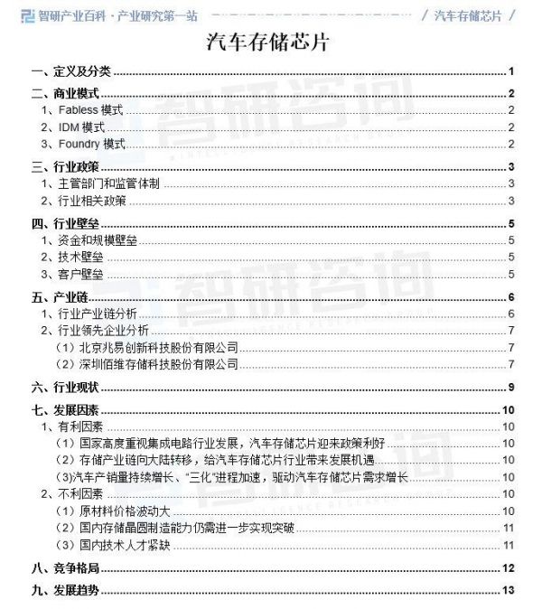 智研产业百科是智研咨询推出的产研工具平台,致力于为您提供全方位的百科式产业信息查询服务。智研咨询践行用信息驱动产业发展的企业使命,完善和丰富企业方法论,依托产业百科平台提升信息价值,持续为行业发展及企业投资决策赋能。汽车存储芯片产业百科作为汽车存储芯片产业一站式系统化研究工具,全面归纳了汽车存储芯片产业知识信息,内容涵盖汽车存储芯片产业的定义、分类、政策、产业链、竞争格局、发展趋势等,并依靠信息技术建立智能互链的行业知识图谱,为行研从业者及相关投资者提供深入的洞察力和全面的信息。