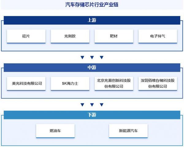汽车存储芯片产业链上游为半导体材料及半导体设备行业,半导体材料主要包括硅片、光刻胶、靶材、电子特气、抛光材料等;半导体设备则包括光刻机、CVD设备、刻蚀设备等。中游为汽车存储芯片设计、晶圆制造、封装测试。产业链下游为燃油车及新能源汽车,汽车存储芯片需求量与汽车行业运行情况息息相关。