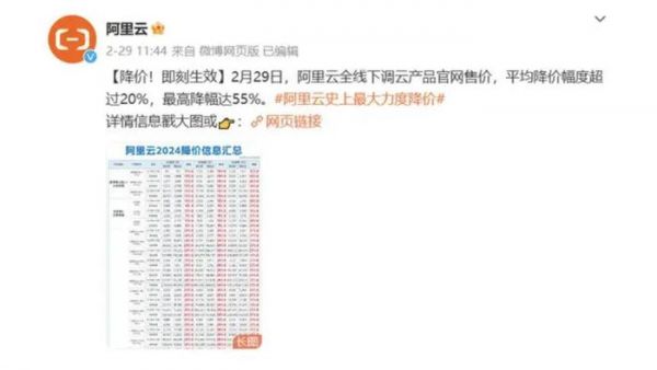 上次降价就在今年2月29号,在2024阿里云战略发布会上,阿里云宣布全线下调中国区云产品官网售价,平均降价幅度超20%,最高降幅达55%,被称为“史上最大力度降价”。