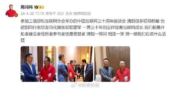 #周鸿祎感慨互联网三十年#360集团创始人、董事长@周鸿祎 发微博称:"参加工信部和互联网协会举办的中国互联网三十周年座谈会 遇到很多领导前辈 也碰到同行老朋友马化腾张朝阳雷军 一晃三十年创业伴随着互联网成长 我们都是开拓者建设者经历者参与者也是受益者 弹指一挥间 相逢一笑 猜一猜我们在说什么话题 "。#周鸿祎马化腾雷军张朝阳共谈互联网三十年#