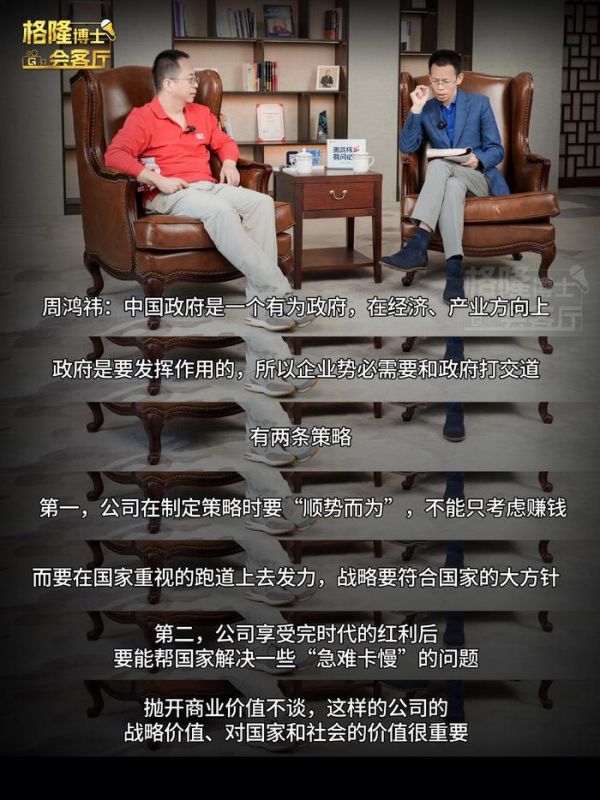 格隆汇4月19日|近日,三六零集团创始人周鸿祎做客格隆汇高端访谈《格隆博士会客厅》。谈及“如何处理政企之间关系”,周鸿祎表示,中国政府是一个有为政府,在经济、产业方向上,政府是要发挥作用的,所以企业势必需要和政府打交道。周鸿祎提出两条策略:第一,公司在制定策略时要“顺势而为”,不能只考虑赚钱,而要在国家重视的跑道上去发力,战略要符合国家的大方针;第二,公司享受完时代的红利后要能帮国家解决一些“急难卡慢”的问题,抛开商业价值不谈,这样的公司的战略价值、对国家和社会的价值很重要。