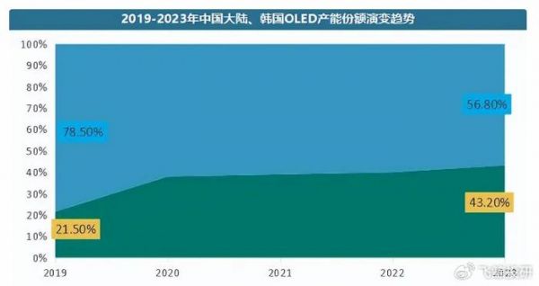 2023年中国大陆OLED产能约占全球产能的43.2%,而在2019年,我国还仅为为21.5%,可见增长之迅猛。
