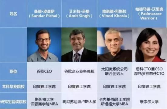 比如,Google首席执行官Sundar Pichai出生于印度泰米尔纳德邦,微软首席执行官Satya Nadella出生于印度特兰加纳邦,Adobe首席执行官Shantanu Narayen也出生在印度特兰加纳邦,美光首席执行官Sanjay Mehrotra也是印度人……