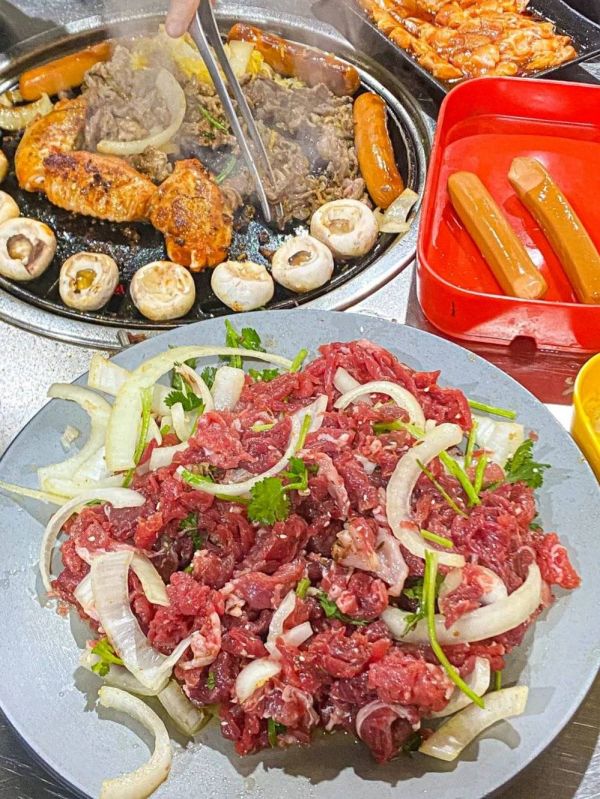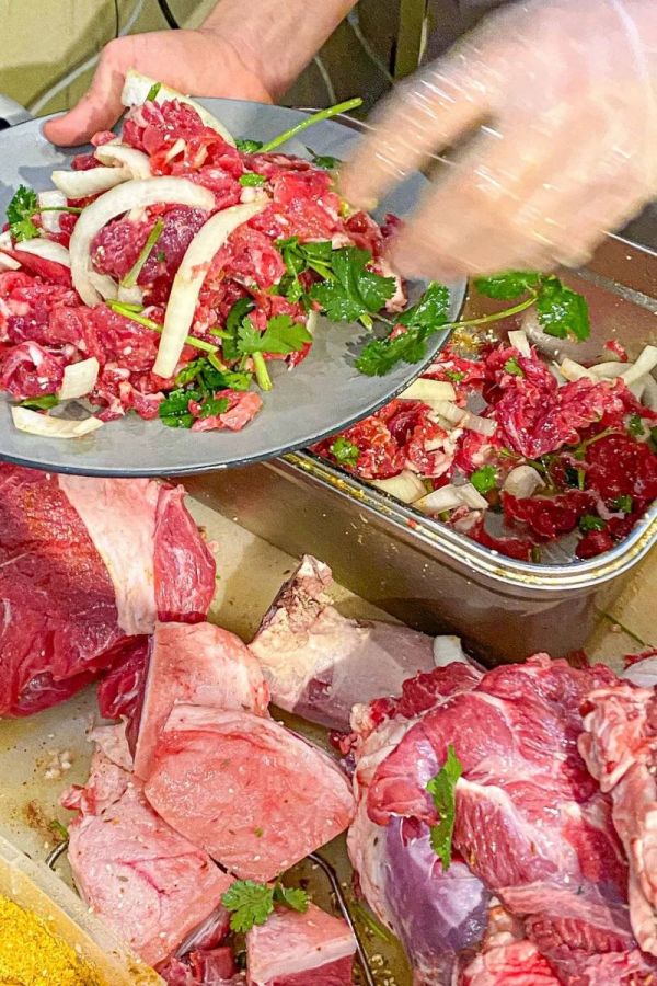选好肉后,老板会在你面前把肉切成薄片,把不同部位的肉都一起扔在一个大铁盆里,随后撒上洋葱、孜然、盐等调味料用手抓拌均匀。至此,三两下的功夫,烤肉已准备好,在齐齐哈尔,每家烤肉店都有自己拌肉的配方和手法,但统一的原则是,简单调味,因为齐齐哈尔的牛已经足够好吃,再多的调味,只是浪费。