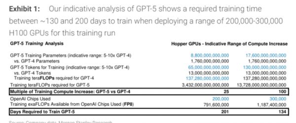 对于即将亮相的GPT-5,摩根士丹利预计,该模型的训练需要部署20万~30万个H100 GPU,耗时130~200 天。