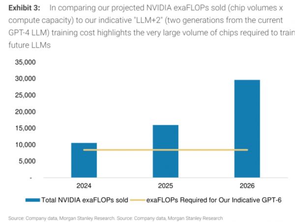 超级计算机将使指数级的增长预期更加容易实现。摩根士丹利模型显示,本十年晚些时候超级计算机为开发大模型提供的算力比当前水平高1000倍以上。