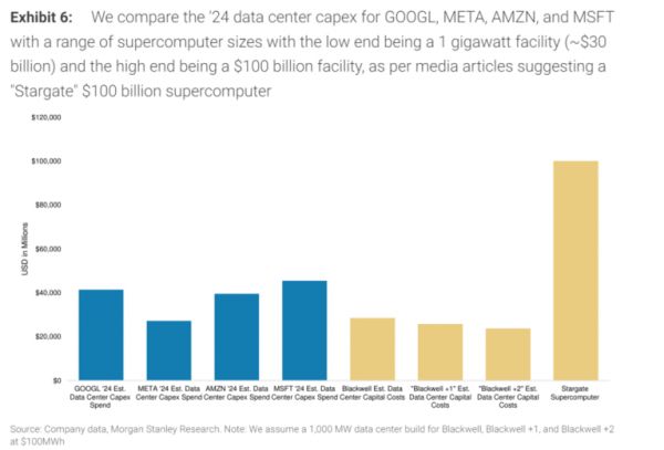 资本投入方面,摩根士丹利将谷歌、Meta、亚马逊和微软在2024年的数据中心资本支出进行了比较,对象是一系列不同规模的超级计算机,其中1吉瓦的超级计算机设施的估算成本约为300亿美元,而更大规模的超级计算机的成本可能高达1000亿美元。