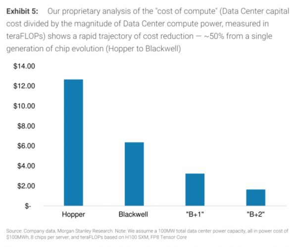 摩根士丹利的专有数据中心模型预测,大模型算力的快速上升,意味着计算成本将快速降低。从单一芯片代的进化(从英伟达Hopper到Blackwell)来看,计算成本下降了大约50%。