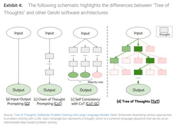 值得注意的是,除了芯片等硬件方面的进步之外,软件架构的创新也将在推动大模型能力提升方面发挥关键作用,特别是Tree of Thoughts架构。