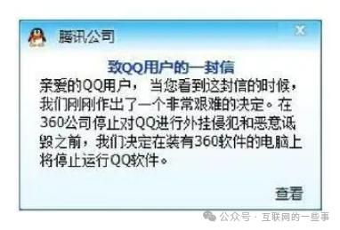随后,11月3日晚,腾讯以QQ弹窗的方式发表了著名的“致全国QQ用户的一封信”声明,以“在装有360软件的电脑上停止运行QQ软件”为威胁,向上亿QQ用户发出最后通牒。