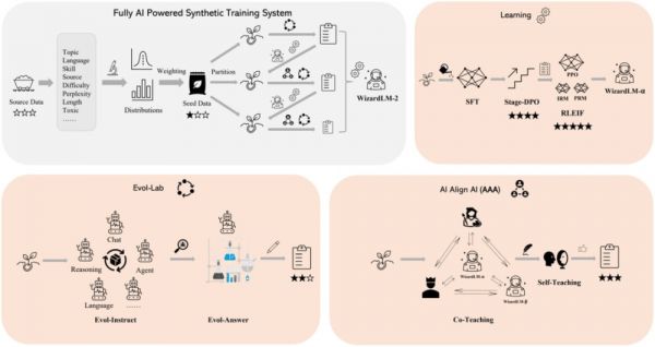 随着天然存在的人类数据逐步被大语言模型训练用尽,我们坚信:AI 精心创造的数据与 AI 分步监督的模型将是通往更强 AI 成果的唯一途径。因此,我们构建了一套完全由 AI 驱动的合成训练系统以增强 WizardLM-2。