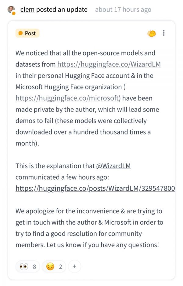 Hugging Face 及其首席执行官 Clément Delangue 对删除表示失望,并强调了 WizardLM 的开源模型对其平台的重大影响。他们正在积极寻求与 Microsoft 的解决方案,以满足社区需求。