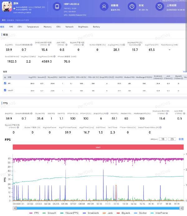 原神全高画质的渲染分辨率不到720p,P70U默认插帧下平均59.9fps/4.58W,但感官流畅度一般。