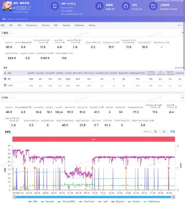 星铁全高画质性能波动较大了,毕竟GPU没有升级,平均45.9fps/6.1W,并且机身温度最高来到了52°C。