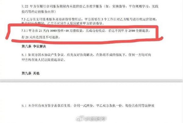 在第三天的课程中,“老师”开始为她推销一款进阶的视频剪辑课程,展示一些老年人成功靠短视频变现的案例,“老师”承诺交付2580元之后,双方会签订一份合同,保证签约学员的短视频平台账号21天内达到1000粉丝,并且有收益,达不到可以全额退款。