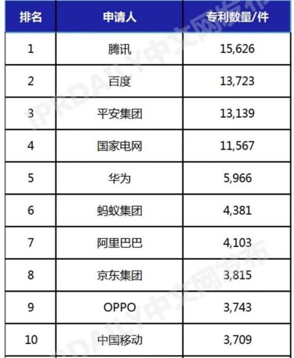 排名第6至10位的均为中国企业,依次为蚂蚁集团(4381件)、阿里巴巴(4103件)、京东集团(3815件)、OPPO(3743件)以及中国移动(3709件)。