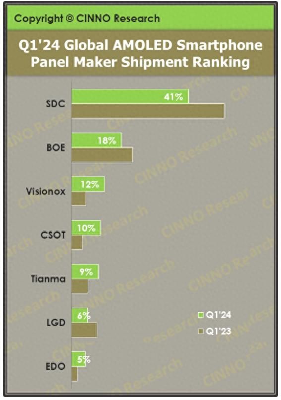 24年Q1季度全球AMOLDE智能手机面板出货量排名:国产厂商表现瞩目