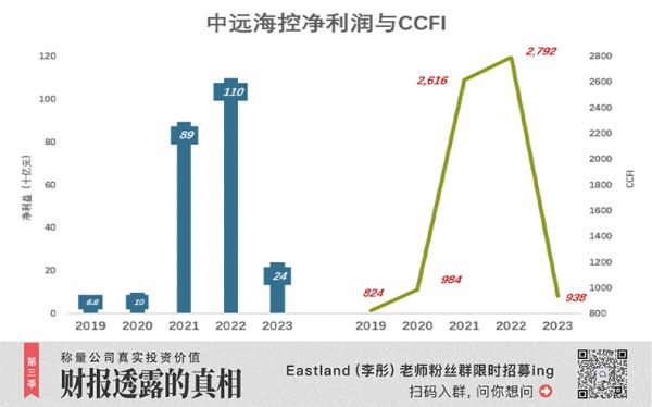 过往五年(2019年~2023年),中远海控年均净利润479.4亿,峰值为2022年的1097亿,低谷是2019年的67.6亿。期间(2023年对比2019年)CCFI指数相差13.8%,而净利润相差253%。