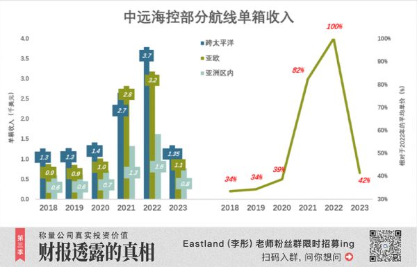 2023年,除中国大陆航线外,中远海控运营航线运量下降了3.5%,平均运价同比下跌了41.6%,几乎是运量降幅的12倍!