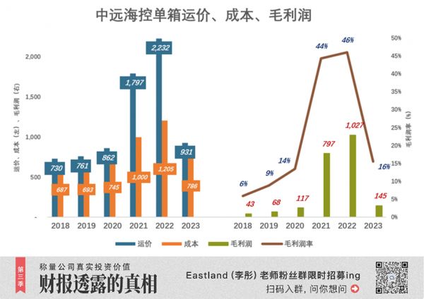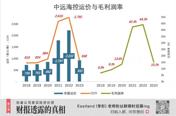 研究中远海控财报,发现它在运价上涨时能吃到整个产业链最大的蛋糕。比如2019年~2021年,价格涨120%、成本涨40%;而在运价下时,承担的损失略高于其它环节。比灵2022年~2023年,价格跌60%、成本只降30%。
