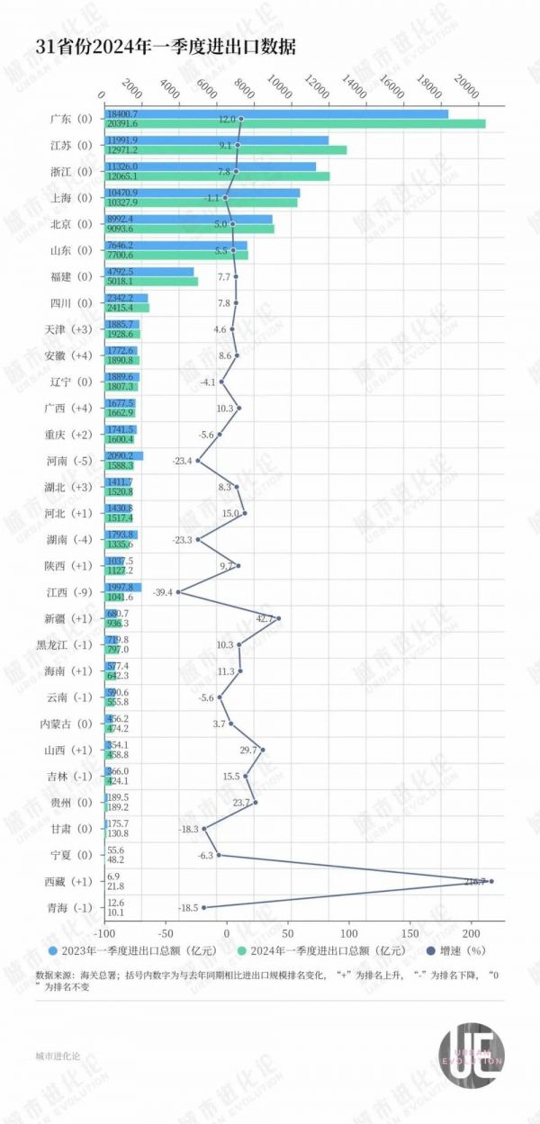 其中,西藏以216.7%的增速领跑全国,江西则以-39.4%的增速垫底。如此这般激烈的变化,也导致全国外贸省份的版图悄然变化。