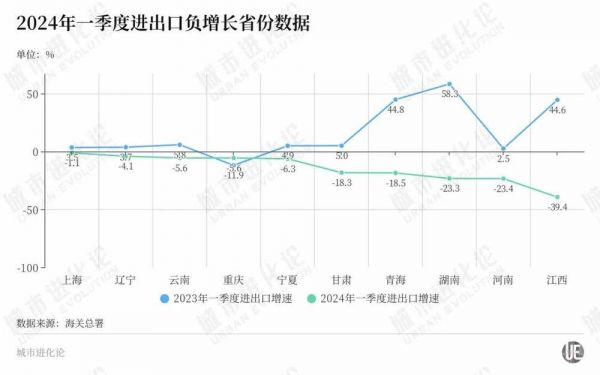 在2023年一季度,7个省份外贸负增长,而今年一季度负增长的省份已经扩大至10个,包括上海、辽宁、重庆、云南、宁夏、甘肃、青海、湖南、河南和江西。