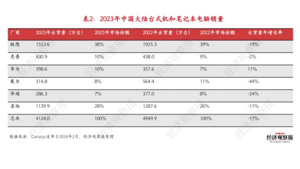 根据市场调研机构Canalys的数据,2023年中国大陆台式机和笔记本电脑销量中,除华为实现同比11%的两位数增长之外,其他厂商都有不同程度的下滑。