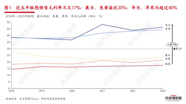 联想销售毛利率亦低于行业竞争对手,2020财年以前不足15%,目前也仅为17%。反观其他PC厂商如惠普(HPQ.NYSE)、戴尔科技(DELL.NYSE),销售毛利率多年来均在20%以上,华为与苹果的销售毛利率保持在40%以上。