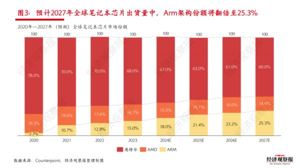 市场研究机构Counterpoint的数据显示,2022年全球PC市场英特尔和AMD共占80%,Arm的份额占12.8%。预计2027年Arm架构份额将翻倍至25.3%,X86份额降至74.4%,其中归属英特尔的份额下降至60%,但领先优势仍明显。